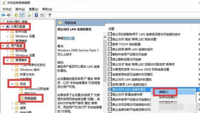 运行输入gpedit.msc,打开“组策略”编辑界面后,依次展开“用户配置→管理模板→网络→网络连接”,在右侧窗口中找到“禁止访问LAN连接的属性”选项并右击,从其右键菜单中选择“编辑”项。选择已启用-确定,就完成了。