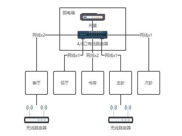 2、入户线,网线入户就直接拉到汇聚点,光纤入户可以将光猫单独留在入户弱电箱,也可拉到汇聚点。