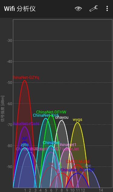 说明:每个“山峰”就代表一个无线信号,“山峰”的高度越高,就说明信号强度越强,信号质量越好。一般来说信号强度在-80dBm以后的就很弱了哈。