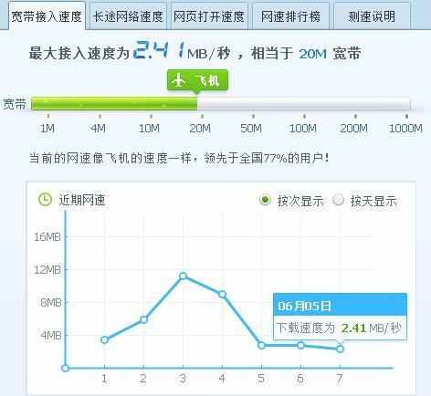 如果需要测速,在360安全卫士中的功能大全,找到宽带测速,然后点击宽带测速器进行带宽测试。可以看到20M宽带的实际测试速度在2.41MBps,使用带宽值除以8是理论下载速度,实际中线路传输还有损耗,粗略可以使用带宽值除以10进行计算,在此范围内均算带宽正常。