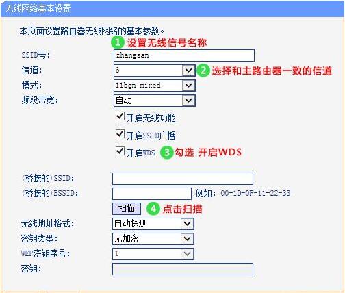 对副路由器进行无线设置,设置无线信号名称,如果和主路由相同可以实现无线信号漫游,如不相同则无法漫游,可以根据自己实际情况设置。信道的选项需和主路由器的信道保持一致。在开启WDS功能后,扫描主路由器的无线信号并选择,填写主路由的无线密钥即可。设置完成后,在副路由器的无线安全设置中,设置和主路由相同的无线密码,直接保存无线桥接就设置完成了。