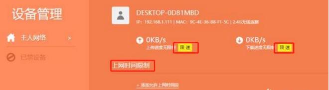 可以在设备管理中,对登录的设备进行限速,包括上网时间、上行、下行速度限制,属于比较温柔的一种方法,通过降低蹭网者上下行速度,可以令其主动放弃连接当前的网络。
