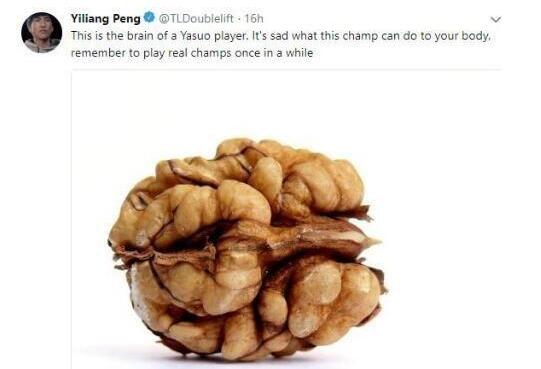北美大师兄也曾经在网上发表言论:“这就是亚索玩家的大脑(一个核桃),为什么不玩点有意义的英雄?”可见职业选手也会被亚索玩家坑的心态爆炸。