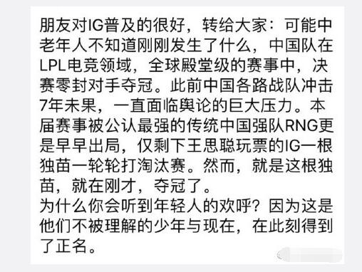 昨晚公司聚餐,在车上同事突然说了一句“IG夺冠了”瞬间点燃了气氛,随后朋友圈就被这条信息刷屏了,虽然我平时也有玩游戏,但是对电竞圈完全不了解,一脸懵逼的状态下完全无法体会他们的激情,吓得我回去后赶紧查了查IG夺冠到底意味着什么。这个时候网络上已经全是IG夺冠的消息了,下面是一些我查到的文章,分享给同样不懂电竞圈的“中老年盆友”