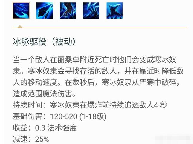 这是冰女新获得的被动技能,从介绍中我们可以看到,只要有敌人在冰女附近死亡,那么他会变成一个寒冰奴隶,并且寻找存活敌人在靠近时爆破,从而造成伤害以及减速效果。