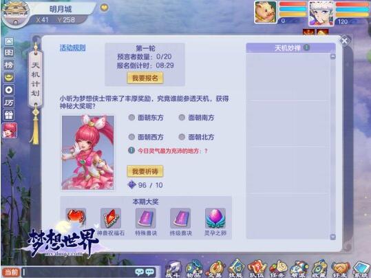 全新活动“天机计划”上线,将于1月18-1月30日,每天19:00-22:00在新服“风云九州”开放,完成日常活动可获得活动道具,活动开启时使用道具预测方位赢取神兽仙兽祝福石、终极兽决等丰厚奖励!