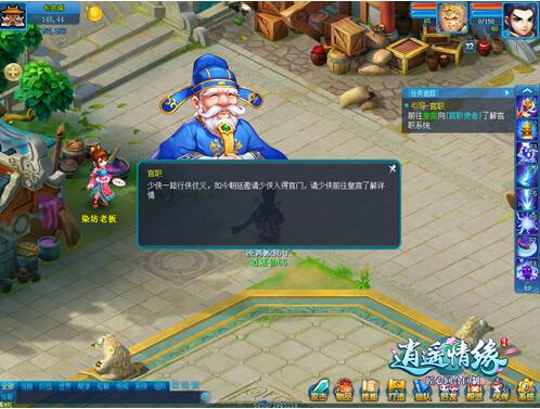 在逍遥世界,当官也要有一定实力的,太脆了还怎么为人民服务?所以首先请把自己的等级提上来吧,只要到了60级,就会有贵人降临,引导你到皇宫,在官职使者处开启官场生涯。可以自由选择文官或者武官,全凭心情,喜欢哪个点哪个,但是一旦确定下来就不能改变,请慎重想好自己以后喜欢的生活再做决定。xunji190101