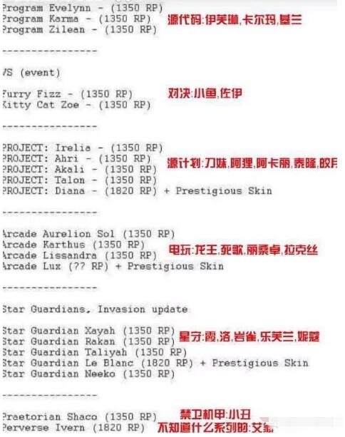 就在近日,外服的玩家爆出了一些皮肤,他们表示这是今年拳头官方将会出品的一些皮肤,其中有源代码的寡妇,扇子妈和时光老头。原计划的刀妹,阿狸,阿卡丽,男刀,皎月。电玩的龙王,死歌,丽桑卓和拉克丝。星之守护者系列的霞,洛,岩雀妖姬和妮蔻。禁卫机甲系列小丑。还有一个不知道什么系列的艾翁。
