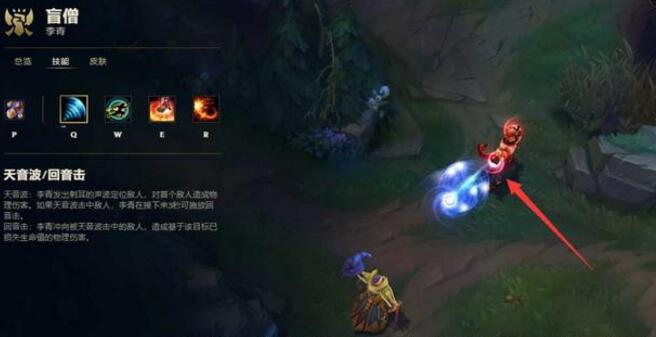依然仔细观察笔者箭头所指的地方,这时盲僧释放E技能,盲僧会瞬间向地面拍地板来达到释放技能的效果,相比Q技能E技能的前摇更为明显,因为E技能的动作幅度会更大。想要完全释放技能,就需要盲僧的手先抬起来,然后从上至下拍到地板上,因此玩家如果能注意到这个动作,就可以通过位移或者闪现及时躲避E技能的伤害以及减速。
