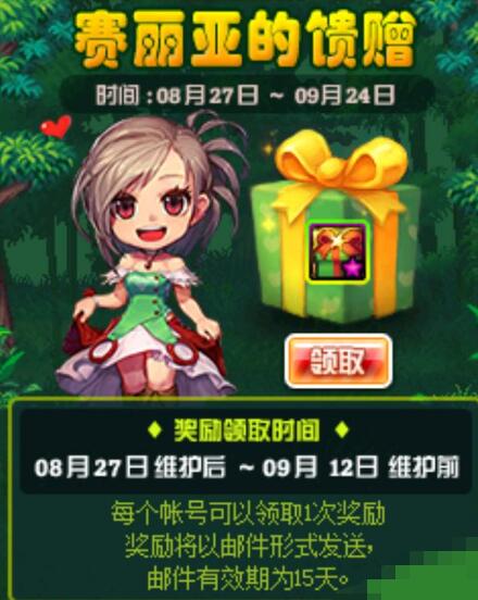 (1)在8.27—9.24期间,玩家登陆游戏,可以获得赛丽亚的馈赠礼盒,该礼盒可以在一周内反复开启7次,累计开启4次后有惊喜大奖。